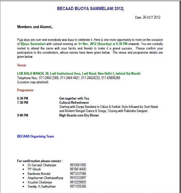 BECAAD is pleased to announce a get-together with cultural evening on 03 Nov 2012, Saturday to hold Bijoya Sammelani 2012 at Bipin Chandra Pal Auditorium, Chittaranjan Park.