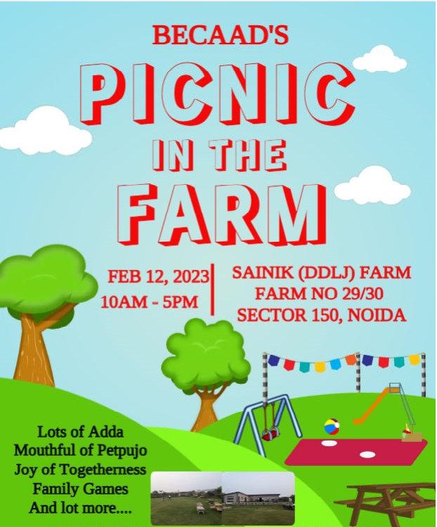 BECAAD is pleased to announce its annual picnic, this time at DDLJ, Sainik Farm, Sector 150, NOIDA. You are cordially invited to join the fun and feast with family and friends. Please extend your assistance to inform and request members/ alumnus to join.